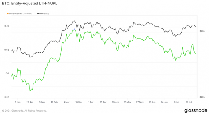 2024年,LTH-NUPL持續(xù)保持在0.5以上,表明長期持有者對市場上升趨勢抱有強烈信心。該指數(shù)經(jīng)歷了5月11日至13日的貪婪階段,隨著Bitcoin創(chuàng)下新的歷史新高,表現(xiàn)出短暫的興奮。自7月以來,LTH-NUPL一直呈上升趨勢,波動較大,7月27日達到0.7,7月31日小幅下降至0.66。