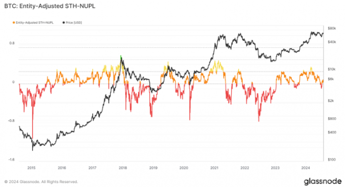 另一方面,實體調(diào)整后的 STH-NUPL 衡量短期持有者的未實現(xiàn)凈利潤或損失,短期持有者定義為持有Bitcoin時間少于155天的實體。從歷史上看,STH-NUPL 在預測市場頂部和底部方面的效果不如 LTH-NUPL。