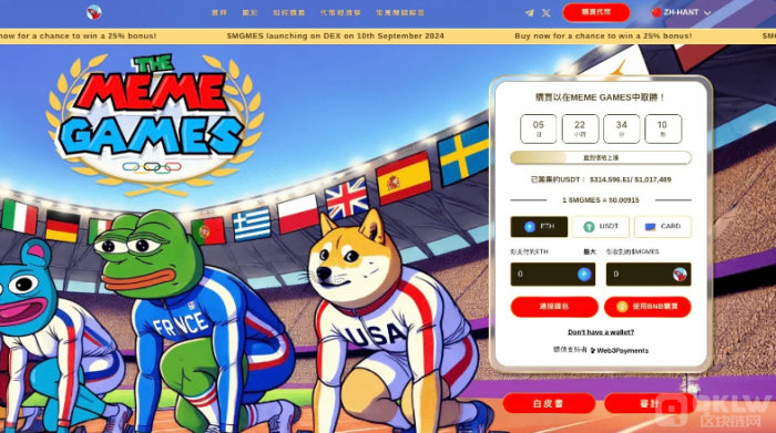 大約38%的總Tokens供應量,或769百萬個Tokens,將提供給預售參與者,另有9.30%,或188百萬個Tokens,將用于比賽獎勵。要參與比賽,只需前往Meme Games網站,連接你的加密錢包(如MetaMask),并使用ETH、USDT或BNB購買Tokens,也接受銀_行_卡支付。