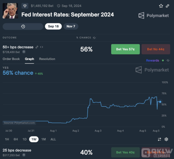 在資本市場動蕩期間,Polymarket用戶發(fā)起了“預估美聯(lián)儲在2024年9月降息幅度”的賭注。據(jù)統(tǒng)計,目前預測美聯(lián)儲將降息超過50個基點的概率為56%,而降息25個基點的概率為40%,分別投注了72.8萬美元及31.7萬美元。