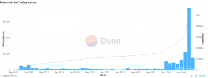 受益于美國大選,Polymarket在7月創(chuàng)下歷史最高交易量,達到3.87億美元,累積用戶數(shù)超過4.4萬名。關(guān)于美國政治事件的預測,推動了該預測市場的累計交易量至今已突破11.37億美元。