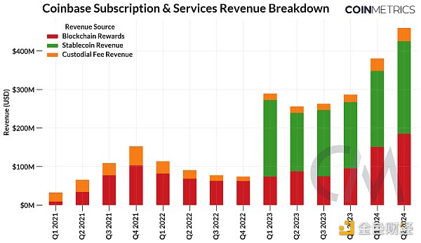 Coinbase的2024年第二季度收益顯示收入來源發生了變化,交易收入環比下降27%,但訂閱和服務收入環比增長17%,其中穩定幣收入是最大的來源。