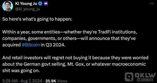Ki Young Ju還預測,未來一年內,包括傳統(tǒng)金融機構、企業(yè)和政府部門在內的部分組織可能會在其2024年第三季度的資產負債表中披露其Bitcoin持倉情況。他補充道:“散戶投資者可能會因為擔憂德國政府拋售、Mt. Gox事件或其他宏觀經濟問題而后悔未能及時買入。”