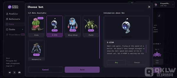 Pixelverse (PIXFI) 是一款基于TG平臺的賽博朋克主題點擊賺錢型游戲,類似于Tapswap和Hamster Kombat。在Pixelverse中,玩家將扮演自由職業者,參與環境對抗(PvE)和玩家對抗(PvP)戰斗,收集文物并定制和強化機器人。游戲采用MMORPG模型,提供身臨其境的實時游戲體驗。