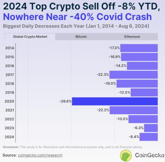 CoinGecko的報(bào)告分析了自2014年1月1日至2024年8月6日的加密市場(chǎng)數(shù)據(jù),重點(diǎn)關(guān)注單日市值跌幅超過(guò)-10%的情況。報(bào)告顯示,自FTX崩盤以來(lái),加密市場(chǎng)并未出現(xiàn)單日市值跌幅超過(guò)-10%的情況。