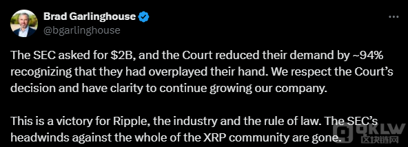 早在2023年7月,美國(guó)紐約南區(qū)地方法院認(rèn)定Ripple面向機(jī)構(gòu)銷售XRP資產(chǎn)的行為違反了聯(lián)邦證券法,并要求后者向其支付近20億美元的罰款,其中包含10億美元非法所得+預(yù)判決利息以及9億美元的民事罰款。但是,8月7日該法院法官Analisa Torres在最終的處罰文件中將最終的罰款金額修改為1.25億美元,較最初的罰款金額下調(diào)了95%左右。