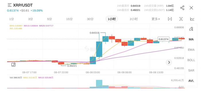 隨后,Ripple首席執(zhí)行官Brad Garlinghouse在推特上表示,該裁決可視作該項(xiàng)目與行業(yè)的共同勝利。受此影響,XRP價(jià)格短時(shí)大漲,從8月8日3時(shí)的0.499美元一路上漲至5時(shí)的0.64美元高點(diǎn),2小時(shí)內(nèi)最高漲幅超過28%。