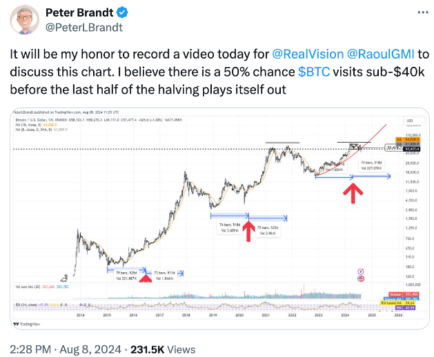 盡管有樂觀的預(yù)期,但并非所有分析師都看好Bitcoin的前景。分析師Peter Brandt在同日的帖子中表示,Bitcoin在減半后的后半段可能還有50%的機(jī)會(huì)跌至40,000美元以下。