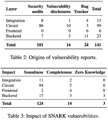 研究顯示,在發現的95個影響正確性的漏洞中,4個則影響系統的完整性。最常見的漏洞源于約束不足,這可能導致測試人員接受無效證明,從而削弱系統的整體安全性。研究還指出,開發人員面臨的挑戰包括適應不同的抽象級別并優化電路以提高效率,這直接關系到SNARK的使用成本。