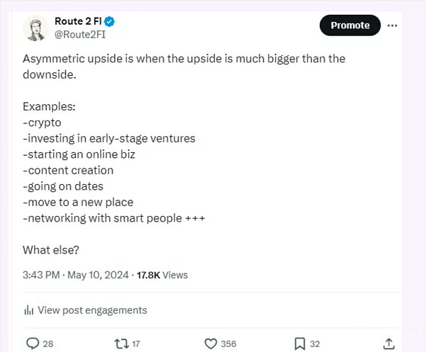 考慮最壞的情況,大多數冒險失敗的后果是回到原點,但成功的可能性卻能將現有資產增加數倍。因此,勇于嘗試高風險、高回報的機會是值得的。