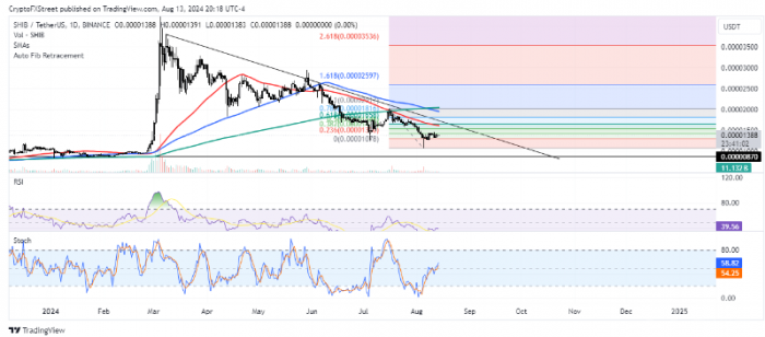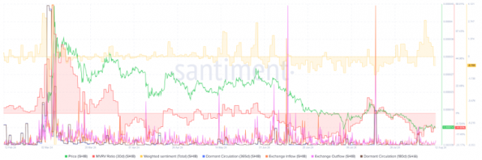 盡管近期市場出現(xiàn)波動,8月5日的市場崩盤對SHIB投資者的影響相對有限。在此期間,凈流入和流通中的不活躍Tokens并未顯示出典型的交易峰值。此外,SHIB的加權(quán)情緒已降至-0.7,顯示出投資者情緒較為低迷,30天市值與當(dāng)前價值(MVRV)比率為-11.9%,表明大多數(shù)投資者平均損失約11%。