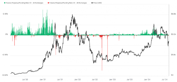 獨(dú)立交易員John Morgan也表示,當(dāng)前資金費(fèi)率和ETH價(jià)格下跌的趨勢表明市場情緒正在轉(zhuǎn)向看跌。Glassnode的數(shù)據(jù)顯示,自2024年初以來,ETH的資金費(fèi)率總體偏正,但最近價(jià)格跌至2100美元時(shí),資金費(fèi)率下降,這表明市場心理發(fā)生了變化。