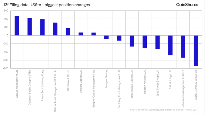 CoinShares的數(shù)據(jù)還顯示,Capula自3月以來購(gòu)買了約4.7億美元的BitcoinETF股票,而高盛和Avenir分別購(gòu)買了4.19億美元和3.88億美元的股票。此外,Galacia Asset Management和DE Shaw分別購(gòu)買了3.07億美元和1.74億美元的股票。