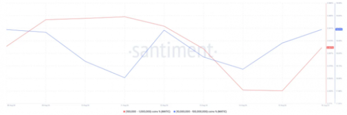 盡管多邊形(MATIC)在近期的市場(chǎng)表現(xiàn)中相對(duì)疲軟,但鯨魚的購(gòu)買活動(dòng)仍然引人注目。Santiment的數(shù)據(jù)顯示,持有10萬(wàn)到100萬(wàn)Tokens的地址余額有所增加,同時(shí)持有1000萬(wàn)到1億Tokens的地址余額也有所上升。鯨魚對(duì)MATIC的增持可能與即將到來(lái)的升級(jí)有關(guān),該升級(jí)預(yù)計(jì)將使MATICTokens在Polygon網(wǎng)絡(luò)中的使用得到增強(qiáng)。盡管本周MATIC價(jià)格下跌了4.5%,但這種購(gòu)買行為可能預(yù)示著對(duì)Tokens未來(lái)的看漲預(yù)期。