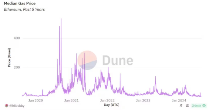 此外,Ethereum網(wǎng)絡(luò)的Dencun升級自3月份以來也對費(fèi)用降低產(chǎn)生了影響。Dencun是一系列重要的網(wǎng)絡(luò)升級,旨在提高Ethereum的性能并減少交易費(fèi)用。升級的實(shí)施提高了網(wǎng)絡(luò)處理能力,進(jìn)一步推動了交易費(fèi)用的下降。