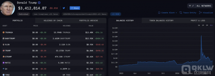 根據 Arkham數據監測,特朗普公開的crypto地址目前持有超過340萬美元的加密資產,這一數額較今年高點已下跌超80%。該地址曾在高峰時期持有高達1800萬美元的資產,這主要得益于與特朗普相關的meme幣暴漲。