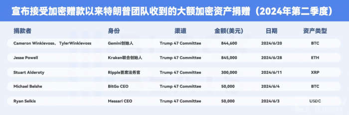 據OpenSecrets統計,截至6月30日,支持特朗普的十大政治行動委員會已籌集了約2.559億美元,其中很大一部分來自傳統金融領域以及美元捐贈。根據特朗普競選團隊提交的第二季度FEC披露文件,通過crypto向特朗普競選團隊捐贈的個人包括Gemini兄弟、Kraken聯合創始人Jesse Powell、Ripple首席法務官Stuart Alderoty、BitGo CEO Michael Belshe、Messari CEO Ryan Selkis等,總捐款額近290萬美元。據breadcrumbs數據,自2024年5月接受BTC捐贈以來,至少價值180萬美元的Bitcoin已捐贈給特朗普競選團隊。