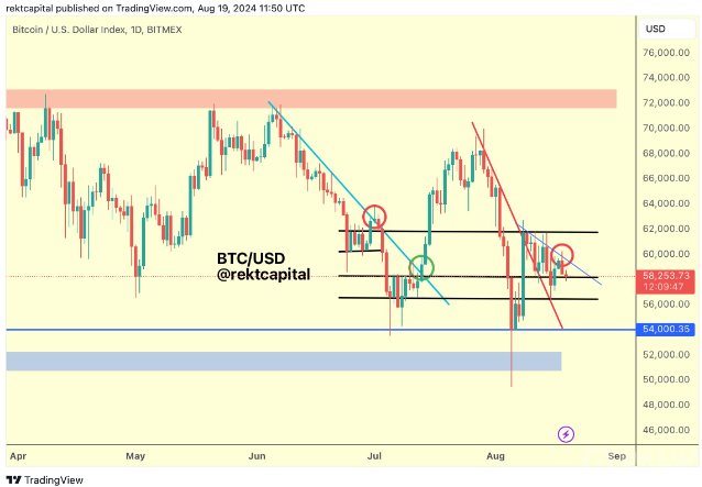 擴(kuò)音器模型通常由多個(gè)高點(diǎn)和低點(diǎn)組成,并在市場(chǎng)極度波動(dòng)時(shí)出現(xiàn),這種模式被認(rèn)為預(yù)示著主要市場(chǎng)頂部或底部。Rekt Capital也警告稱,Bitcoin價(jià)格如果未能突破當(dāng)前的下降趨勢(shì)線,可能會(huì)在短期內(nèi)出現(xiàn)回調(diào)。他表示:“Bitcoin的實(shí)際情況可能是繼續(xù)下跌,直到出現(xiàn)爆發(fā)性增長(zhǎng)。Bitcoin只需每日收盤(pán)價(jià)高于下降趨勢(shì)線,即可改變現(xiàn)狀。”