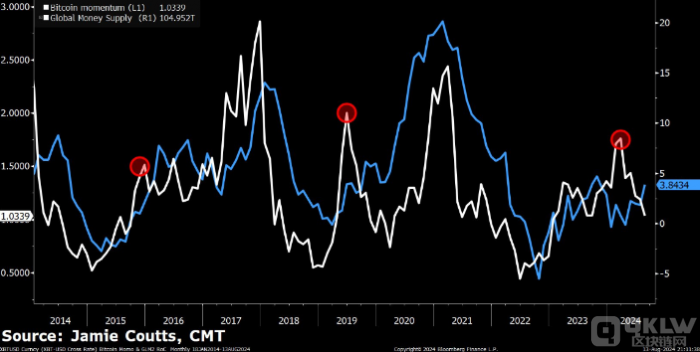 此外,宏觀經(jīng)濟(jì)環(huán)境也被認(rèn)為對(duì)Bitcoin的價(jià)格形成了支持。Real Vision的首席crypto分析師Jamie Coutts指出,由于全球M2貨幣供應(yīng)量的增加,Bitcoin可能會(huì)迎來(lái)突破的契機(jī)。他在8月13日的帖子中提到:“過(guò)去十年,Bitcoin通常會(huì)在全球M2貨幣供應(yīng)量觸底前幾個(gè)月見(jiàn)底。隨后,它通常會(huì)因流動(dòng)性增加而上漲,并經(jīng)歷周期中期修正。”