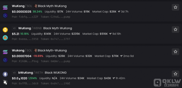 不過,由于《黑神話:悟空》的人氣高漲,幣圈已經涌現出大量相關迷因幣,甚至有交易對TVL超過百萬美元。有同名迷因幣Wukong在單日大漲超過38%,但也有同名迷因幣單日大跌19%。需要注意的是,目前推測這些Tokens與《黑神話:悟空》官方沒有任何關系,現階段也無法確認Tokens建立者是否與廠商游戲科學有關。