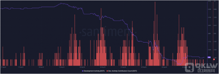 Santiment 的分析顯示,盡管開發(fā)者數(shù)量有所增加,但 DOT 的開發(fā)活動(dòng)在過去 7 天內(nèi)出現(xiàn)了急劇下降。這一趨勢(shì)可能影響投資者對(duì) Polkadot 的信心。