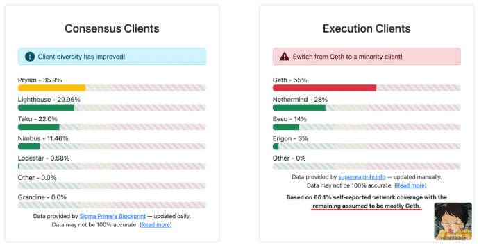 社區(qū)也在倡導(dǎo)多樣化的執(zhí)行客戶端選擇,鼓勵用戶轉(zhuǎn)向較少使用的客戶端,以進(jìn)一步減輕風(fēng)險。此外,新提案允許驗證者Node同時與多個客戶端驗證區(qū)塊,進(jìn)一步降低了集中化的風(fēng)險。