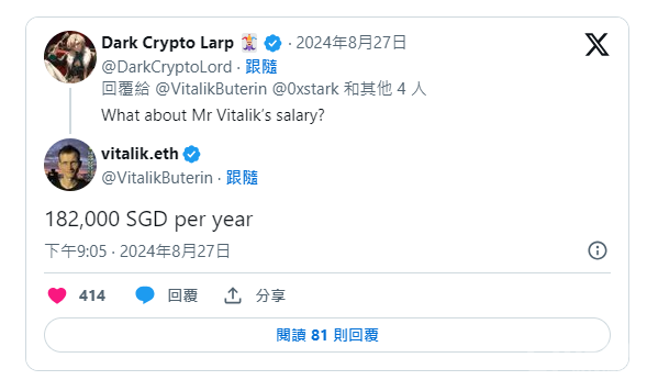 當被網友 Dark Crypto Larp 問及人們關心的薪水問題時,Vitalik Buterin 直言不諱地透露,他的年薪為 18.2 萬新加坡元(約合98萬人民幣)。