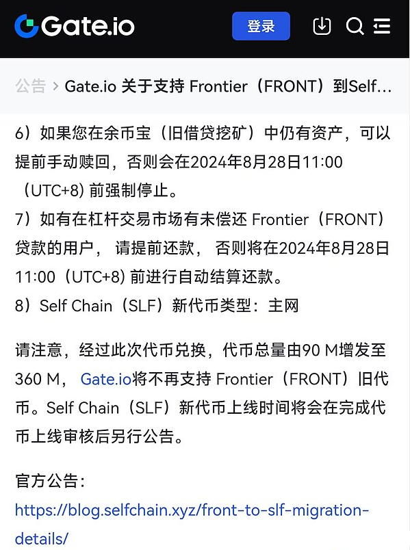 8月30日,幣安宣布完成Frontier(FRONT)Tokens的置換和品牌升級(jí),F(xiàn)rontier更名為Self Chain(SLF),SLF成為新Tokens代碼。根據(jù)公告,所有FRONTTokens按照1:1的比例置換為SLFTokens。然而,令社區(qū)成員感到憤怒的是,F(xiàn)RONT的Tokens總量在此過(guò)程中從9000萬(wàn)枚增發(fā)至3.6億枚,但置換補(bǔ)償卻并未調(diào)整,導(dǎo)致投資者手中的Tokens價(jià)值被大幅稀釋。