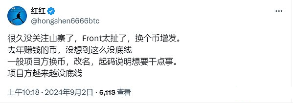 近年來(lái),Blockchain項(xiàng)目改名已經(jīng)成為一種趨勢(shì),近期包括MakerDAO更名為Sky Protocol、MATIC更名為POL、Fantom更名為Sonic Labs等,但通常情況下,這些項(xiàng)目都會(huì)在Tokens置換過(guò)程中給予投資者等值的Tokens。然而,最近Frontier項(xiàng)目的Tokens置換操作卻引發(fā)了廣泛的社區(qū)爭(zhēng)議。盡管項(xiàng)目方將Tokens總量增發(fā)了四倍,但投資者卻只獲得了按原比例置換的Tokens,這一操作引發(fā)了社區(qū)的強(qiáng)烈不滿。