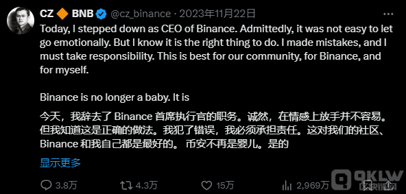 “今天,我辭去了幣安首席執行官的職務。情感上的放下并不容易,但我知道這是正確的決定。我犯了錯誤,我必須承擔責任,這對我們的社區、幣安和我自己都是最好的選擇。幣安已經成熟,現在是時候讓它獨立發展。我相信幣安會繼續成長,并憑借其強大的團隊脫穎而出。”