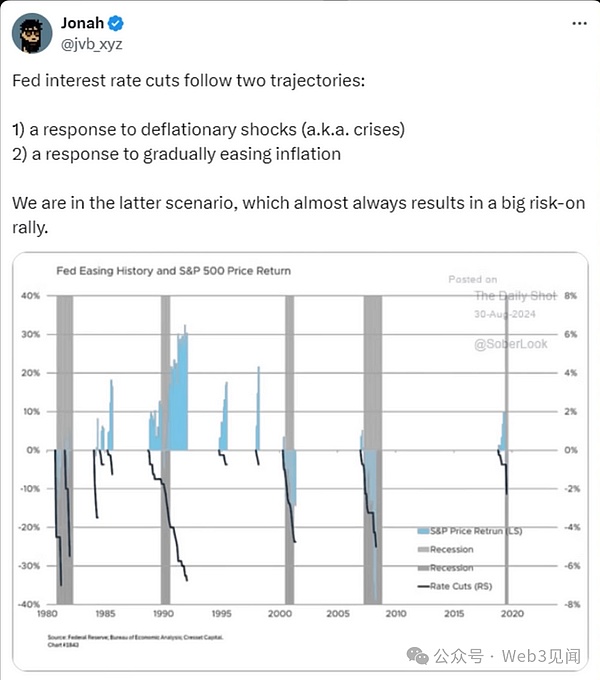 現(xiàn)在,美聯(lián)儲通常會出于兩種原因之一降息:應對通貨緊縮沖擊或應對逐步緩解的通脹。從歷史上看,第二種情況幾乎總是會導致大幅風險偏好反彈,即股票或Crypto等風險市場出現(xiàn)反彈。