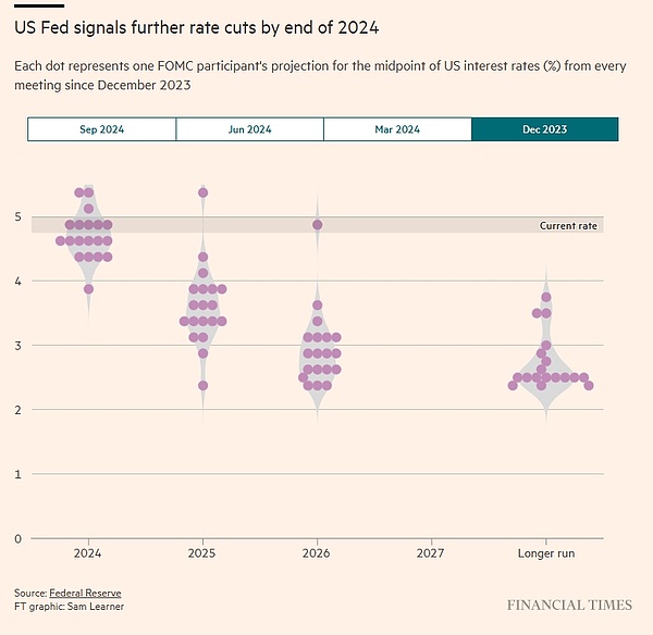 美聯儲官員們也明確表示他們不會止步于此,周三公布的所謂點陣圖預測顯示,聯邦公開市場委員會(FOMC)的大多數成員估計今年政策利率將再下降半個百分點,隨后在2025年進行一系列降息,將利率保持在3.25%至3.5%區間。