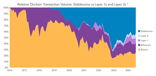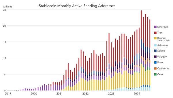 根據(jù)穩(wěn)定幣活躍程度與加密市場周期之間的差異,可以明顯看出,穩(wěn)定幣的使用已不再僅僅服務(wù)于加密用戶和交易使用場景。