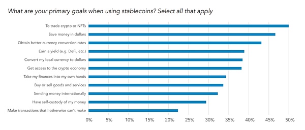 當(dāng)被問及非加密的穩(wěn)定幣活動(dòng)時(shí),最常見的使用場景是貨幣替代(69%),其次是支付商品和服務(wù)(39%)以及跨境支付(39%)。很明顯,在被調(diào)查的國家中,穩(wěn)定幣已從單純的交易抵押品演變?yōu)槠毡槭褂玫臄?shù)字美元工具。