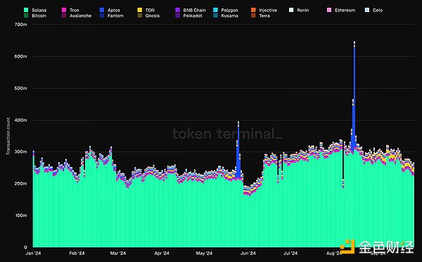 在收入方面,由于Dencun之后的費用影響以及Solana和Tron上活動的增加,我們看到了重大變化。在Dencun之后,Ethereum超聲波貨幣理論明顯崩潰,8月底,Ethereum的收入份額跌至5%以下。