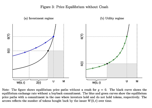 活動(dòng)增長:假設(shè)交易平臺(tái)的活動(dòng)以固定的增長率\(g 活動(dòng)量:在沒有發(fā)生崩潰的情況下,平臺(tái)在時(shí)間\(t\)的活動(dòng)量為 \(A(t)=e^{gt}\),否則\(A(t)\)接近于0。 此模型考慮了Tokens的效用需求和交易所為回購Tokens而投入的資源量如何與平臺(tái)活動(dòng)成正比,進(jìn)一步設(shè)定了交易所運(yùn)行概率和違約強(qiáng)度,為理解交易所Tokens的市場動(dòng)態(tài)提供了一個(gè)全面的分析框架。五、均衡分析 A.市場清算條件的圖形表示 在分析均衡結(jié)果之前,文章提供了市場清算條件的圖形表示。圖2展示了市場清算條件的機(jī)制,其中給定的X$(t)值由圖中的陰影矩形表示。向上傾斜的曲線代表了用戶向投資者和交易平臺(tái)提供Tokens的供給曲線。投資者和交易平臺(tái)持有的Tokens總量為W(0,t)+Z(t),用戶則持有剩余部分,即MW(0,t)Z(t)。用戶保持的美元余額為X$(t)。如果匯率上升,用戶愿意提供更多的Tokens,因?yàn)樗麄冃枰^少的Tokens來維持相同的美元余額X$(t)。這導(dǎo)致了匯率與投資用途Tokens數(shù)量之間關(guān)系的向上曲線。 B.有無投資者的均衡匯率 均衡匯率水平取決于平臺(tái)的回購承諾是否足夠大,能夠吸引投資者持有Tokens。要讓投資者持有Tokens,所需的回購資源隨著投資者預(yù)期回報(bào)的增加、平臺(tái)的失敗率上升而增加,隨著平臺(tái)增長率的增加而減少。 圖(a)顯示了當(dāng)投資者選擇持有Tokens時(shí),回購計(jì)劃下的均衡路徑;圖(b)則顯示了當(dāng)投資者不持有Tokens,平臺(tái)僅從用戶手中回購時(shí)的均衡路徑。在g=0(平臺(tái)無增長)的情況下,黑色曲線未發(fā)生變化,匯率的變化完全由回購驅(qū)動(dòng)。 推論1 在完全回購計(jì)劃中,如果Y$>(r+λg)X$,那么初始均衡匯率為 S(0)=1/M*Y$/(r+λg)。否則,初始均衡匯率為S(0)=X$/M。如果投資者持有Tokens,匯率的變化類似于戈登增長模型下持續(xù)增長的現(xiàn)金流估值。如果投資者不持有Tokens,初始匯率僅反映用戶需求與Tokens數(shù)量的比例。 六、平臺(tái)的回購計(jì)劃成本 A.資本成本與所需回報(bào)率之間的差距 本文利用模型評估交易所通過回購承諾籌集的額外資金與回購計(jì)劃預(yù)期成本之間的差異。交易所通過出售帶有回購承諾的Tokens獲得的資金,等于Tokens總量乘以均衡匯率。若沒有回購承諾,交易所出售Tokens的收入為X$,因此回購承諾帶來的增量收入為差額。C表示回購計(jì)劃整個(gè)期間的預(yù)期成本,這可以通過計(jì)算出整個(gè)計(jì)劃的折現(xiàn)成本來得出。 命題2 通過提供回購承諾,交易所能夠籌集的額外資金少于其預(yù)期的折現(xiàn)成本。 該命題表明,通過回購承諾籌集的資金成本高于投資者要求的回報(bào)率。因此,若交易所能夠通過更高效的資本市場以較低成本籌資,則應(yīng)避免回購承諾。 B.價(jià)格操縱下的額外成本 通過回購承諾發(fā)行Tokens可能導(dǎo)致更高的成本,尤其是可能被大投資者通過“銷毀”Tokens(即永久凍結(jié)Tokens)來操縱價(jià)格。此時(shí),平臺(tái)可能被迫無限期回購,推高Tokens價(jià)格。 1. 單一大投資者 命題3 如果一個(gè)大投資者持有用戶未持有的所有Tokens,則投資者可以銷毀部分Tokens,前提是某些條件成立。這使得Tokens價(jià)格上漲,回購速度放緩,最終導(dǎo)致平臺(tái)無法完成回購計(jì)劃,價(jià)格持續(xù)上漲。 2. 一個(gè)大投資者,多個(gè)小投資者 命題4 若最大投資者持有的Tokens比例達(dá)到一定水平,則銷毀部分Tokens對其有利。在這種情況下,即使有其他小投資者加入銷毀行動(dòng),最大的投資者仍能從中獲利。 3. 許多小投資者 當(dāng)沒有單個(gè)投資者持有足夠的Tokens來進(jìn)行操縱時(shí),多個(gè)投資者可以通過合作銷毀Tokens獲利。這種合作通過Blockchain上的多重輸入交易可以實(shí)現(xiàn),盡管在實(shí)際操作中協(xié)調(diào)多個(gè)投資者可能較為復(fù)雜。 4. 防止操縱 平臺(tái)可以通過限制回購承諾的Tokens數(shù)量來防止操縱。如果平臺(tái)承諾回購的Tokens數(shù)量超過Tokens總量的一半,則容易受到操縱。因此,許多平臺(tái)通常會(huì)限制回購承諾的比例在50%以內(nèi)。七、具有投資動(dòng)機(jī)的用戶 在本節(jié)中,討論了用戶對Tokens的需求受其價(jià)格升值率影響的情形,尤其是在回購計(jì)劃是全額回購時(shí)的情況。即便平臺(tái)只承諾少量資源用于回購,只要用戶有投資動(dòng)機(jī),回購承諾仍然會(huì)對Tokens價(jià)格產(chǎn)生影響,從而影響平臺(tái)通過Tokens銷售籌集的資金量。 命題5 當(dāng)用戶的需求取決于Tokens升值率時(shí),回購承諾的資源越多,用戶需求和平臺(tái)通過Tokens銷售籌集的資金也會(huì)越多。 例如,如果用戶的效用函數(shù)是對數(shù)函數(shù),回購承諾的資源越多,初始均衡匯率就會(huì)越高。 八、結(jié)論 本文得出,回購承諾對加密交易所Tokens的價(jià)格動(dòng)態(tài)有顯著影響,并且在某些情況下可能導(dǎo)致劇烈的價(jià)格波動(dòng);刭彸兄Z是一種成本高昂的籌資方式,可能會(huì)被大投資者或多個(gè)小投資者利用。因此,回購承諾的存在通常表明平臺(tái)在傳統(tǒng)資本市場中面臨融資障礙。