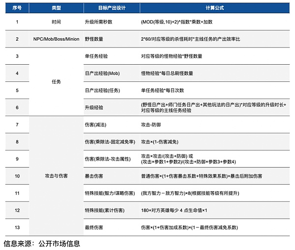 游戲數(shù)值規(guī)劃是一個動態(tài)的過程,需要根據(jù)玩家定位和喜好、實際運營情況以及玩家反饋等數(shù)據(jù)不斷調(diào)整。在MOBA游戲中,這可能涉及地圖大小、角色移動速度、各種屬性、職業(yè)成長趨勢、技能爆發(fā)傷害比重、裝備效果、高級屬性對戰(zhàn)斗的影響等方面的研究。游戲開發(fā)者需要深入了解玩家的興趣,以確保游戲能夠吸引并留住玩家。本分析系列第二篇會針對游戲數(shù)值策劃方向詳細分析,本文暫不詳細展開。同時,可以參考相關(guān)游戲數(shù)值相關(guān)書籍,如『平衡掌控者:游戲數(shù)值戰(zhàn)斗設(shè)計』。下圖為一例游戲數(shù)值系統(tǒng)的案例。