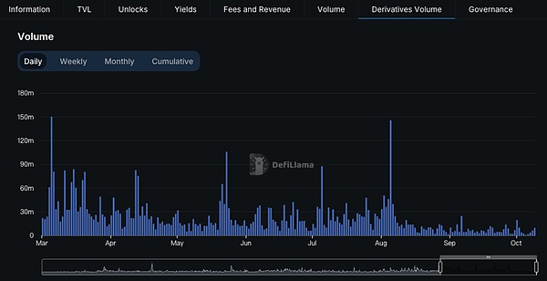 從DefiLlama的DerivativesVolume觀察3月以來各大鏈上衍生品平臺的表現,在3-9月份,Hyperliquid和dYdX的衍生品交易量保持領先,基本能夠維持15億美金左右的日交易量,SynFutures能夠實現10億美金左右的日交易量,領先Jupiter、GMX等選手,處于衍生品賽道的第一梯隊。