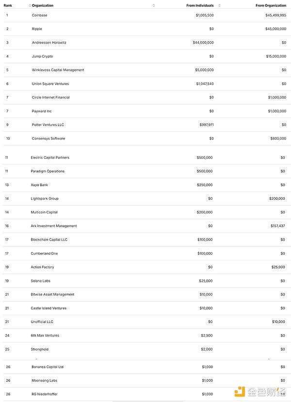 機構方面,大部分捐款來自Coinbase、Ripple和JumpCrypto這三個Crypto交易平臺,分別投入4650萬美元、4650萬美元和1500萬美元,總額約為1.08億美元。A16Z也投入了4520萬美元。