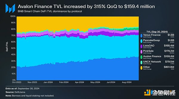 在前六大協(xié)議中,除VenusFinance外,唯一TVL有所增長的是AvalonFinance,這是一個在多個網(wǎng)絡(luò)上為基于BTC資產(chǎn)提供借貸服務(wù)的協(xié)議。AvalonFinance于5月在BNBSmartChain上推出借貸市場,并迅速獲得了8位數(shù)的TVL。7月31日,AvalonFinance被宣布為BNBIncubationAlliance第二輪的獲勝者之一,這使其快速進入了BNBChain的最有價值建設(shè)者(MVB)計劃。在這一宣布之后,AvalonFinance的TVL迅速超過1億美元,并在季度末達(dá)到1.594億美元(環(huán)比從3,840萬美元增長315%)。