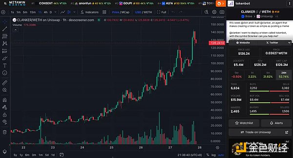 Clanker是由dish和proxystudio.eth開發的AIAgent,其原生Tokens為$CLANKER,目前市值$126M。Clanker已經成為一款基于AI技術的去中心化Tokens生成平臺,用戶只需在Farcaster平臺上艾特Clanker,并輸入希望創建的Tokens名稱,CLANKER系統便會自動生成Tokens并提供對應的Clanker.world鏈接,方便用戶查看和管理。社區甚至將其和PumpFun作為對比,還創建了Dune看板進行數據分析。