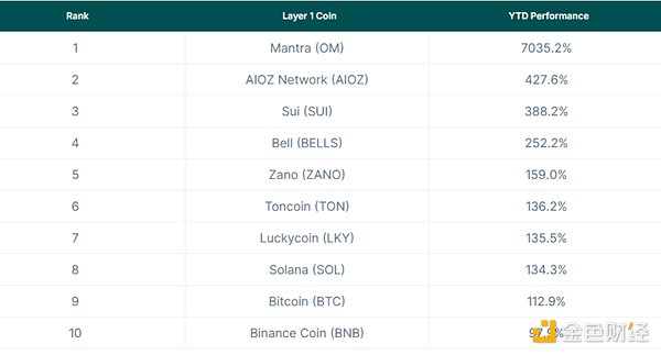 注:本研究分析了CoinGecko中Layer1類別下按市值排序的前100種Crypto的價(jià)格收益情況。數(shù)據(jù)統(tǒng)計(jì)的YTD漲幅覆蓋從2024年1月1日到11月18日的表現(xiàn)。這些數(shù)據(jù)反映了市場(chǎng)的一個(gè)截面,反映了各個(gè)幣種在更廣泛市場(chǎng)環(huán)境中的表現(xiàn)差異。