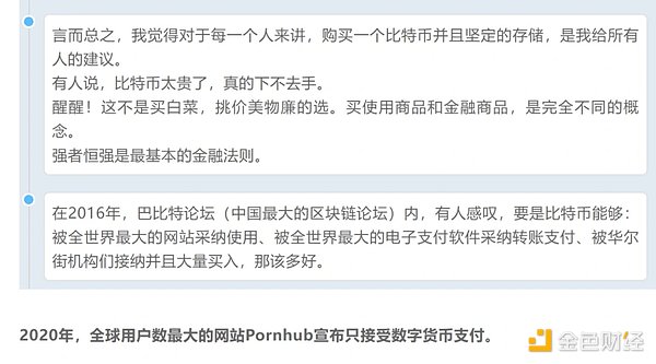 BTC的價(jià)值,從產(chǎn)業(yè)維度來說,我想分成宏觀、中觀和微觀三個(gè)層面再談?wù)劇:暧^來看,BTC代表著人類整個(gè)金融市場(chǎng)的避險(xiǎn)預(yù)期,以及人類歷史上繼債券、股票后第三種可以資本化的「金融介質(zhì)」;中觀來看,BTC是未來人類所必然進(jìn)入的「數(shù)字時(shí)代」也就是web3世界產(chǎn)值最好的「指數(shù)」;微觀來看,BTC在合規(guī)監(jiān)管方面逐漸健全,將在美國(guó)等主流國(guó)家吸引大量「?jìng)鹘y(tǒng)老錢」。在第三世界國(guó)家,則虹吸了本土無法被滿足的民間投資需求。