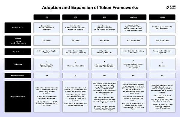 此字段反映了每個(gè)框架部署的鏈的數(shù)量,即每個(gè)應(yīng)用程序或Tokens發(fā)行者如果決定使用特定框架,可以支持的鏈的數(shù)量。這與應(yīng)用程序可以接觸的市場(chǎng)和DeFi生態(tài)系統(tǒng)的數(shù)量直接相關(guān)。更高的鏈部署意味著更廣泛的流動(dòng)性訪問(wèn)。