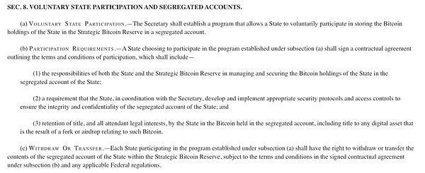 此外,本法案進(jìn)一步確認(rèn)并保護(hù)個人完全合法地控制Bitcoin和其他數(shù)字資產(chǎn)的權(quán)利,明確指出維護(hù)私人密鑰的能力是金融主權(quán)的基本原則,以及在數(shù)字時代中對隱私和個人自由的保護(hù)。