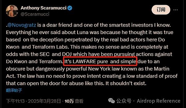 他說(shuō)紐約州用一條過(guò)于寬泛的法律——馬丁法案(MartinAct),根本不需要證明被告的欺詐意圖,就能讓企業(yè)屈服付錢(qián)了事。言辭犀利,一針見(jiàn)血。這條推文一夜之間收獲了上千次轉(zhuǎn)發(fā)和點(diǎn)贊,迅速在加密社群發(fā)酵。