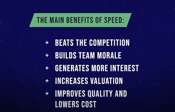 當我回顧NFX投資人總結的所有他們尋找的創業者和公司特質時,我發現它們最終都匯聚到了一個指標:速度。無論是優秀的溝通能力、對產品的癡迷、面對挫折的韌性、深刻的市場洞察,還是對營銷、銷售、技術的理解,所有這些讓公司成功的要素最終都體現在速度這一個維度上。當NFX投資人看到創始人能夠立即回復郵件請求,看到他們快速修改演示文稿,看到他們迅速發布產品,看到他們與客戶快速互動時,這種速度就是他們在尋找的指標,也是所有想要進入創業生涯的人應該關注的指標。