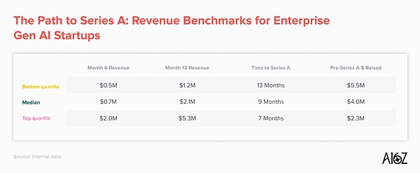 從a16z投資人分析的數百家公司數據來看,我們確實正處在一個新的創業增長時代。企業級公司樣本中的中位數在第一年就達到了超過200萬美元的年收入,在開始盈利后僅九個月就完成了A輪融資。消費級公司的表現甚至更好,達到了420萬美元的年收入,并在八個月內完成了A輪融資。曾經被認為是"一流水平"的從零到100萬美元年收入的增長速度,現在處于我們看到的增長的較低端。