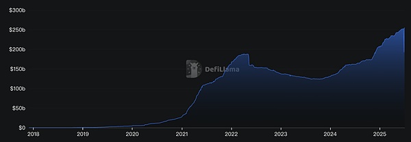 全球穩定幣市值增長趨勢(2019–2025):穩定幣總市值從2019年底不足100億美元攀升至2025年第二季度的逾2500億美元規模 。這意味著自2020年底以來增長了5倍以上,反映出穩定幣需求的爆發式擴張和在加密市場中的地位迅速提升。