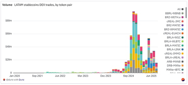 BRLA正成為兌美元主通道,BRLA–USDC(9,750萬(wàn)美元)與BRLA–USDT(2,130萬(wàn)美元)為核心交易對(duì)。自2025年3月起,BRLA–USDC幾乎一直位列數(shù)據(jù)集中最大的USD計(jì)價(jià)交易對(duì)(僅5月被MXNB交易對(duì)短暫超越)。BRLA雖未觸及cREAL峰值,但2025年7月交易對(duì)總成交900萬(wàn)美元,幾乎是當(dāng)月cREAL的兩倍,為自身2024年7月的三倍。